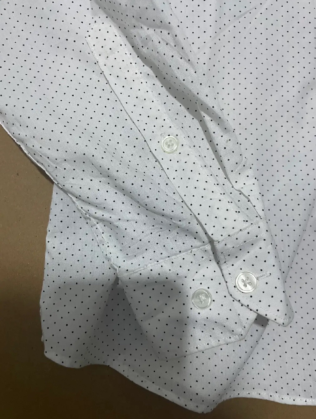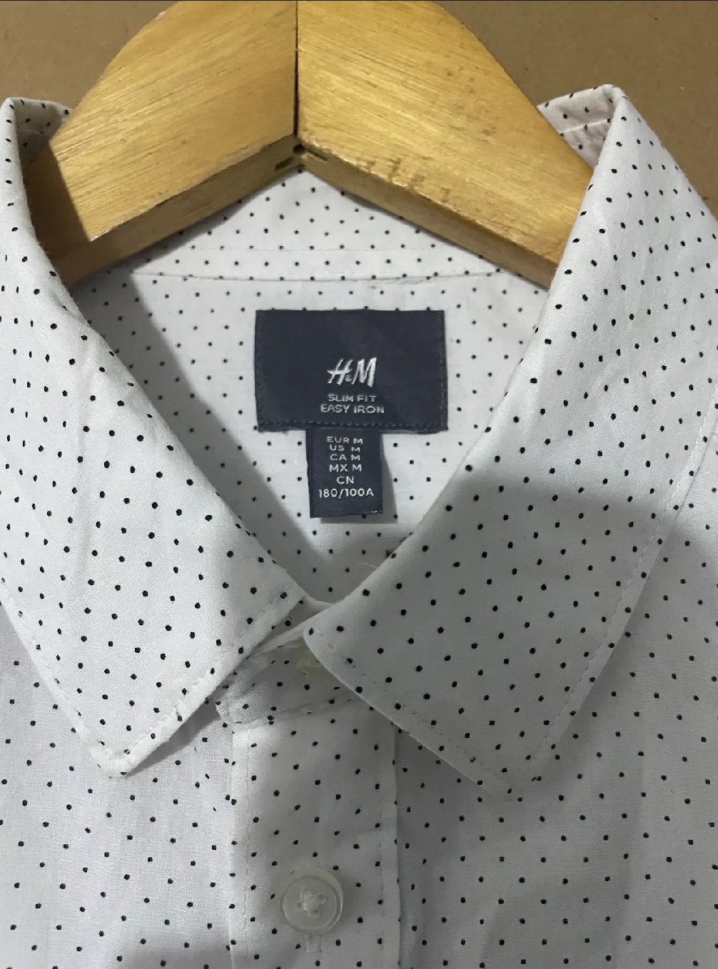 H&M men’s long sleeve shirt made from high quality cotton for a soft, breathable, and comfortable feel. Designed in a classic white color with subtle black dot detailing for a modern touch. Features a structured collar, full button-down front, and long sleeves with buttoned cuffs. Perfect for office wear, formal events, or smart-casual outfits. Easy to pair with trousers, chinos, or jeans.