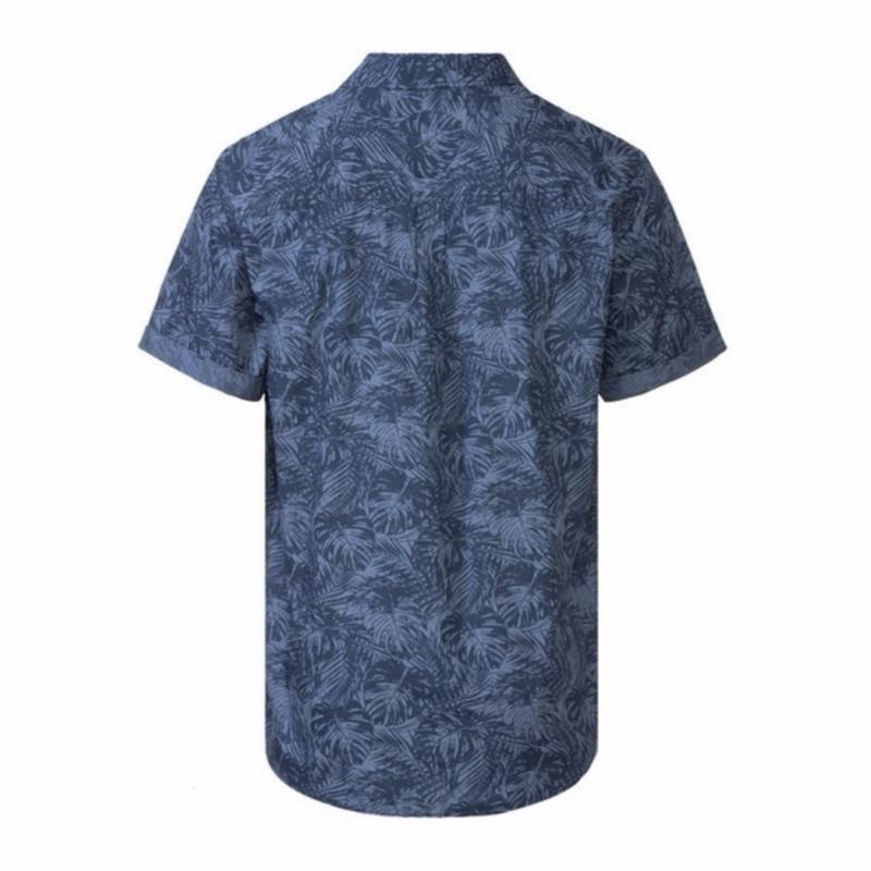 LIVERGY men’s short sleeve button-up shirt with a blue leaf or foliage print. LIVERGY is a registered trademark brand owned by Lidl Stiftung & Co. KG.