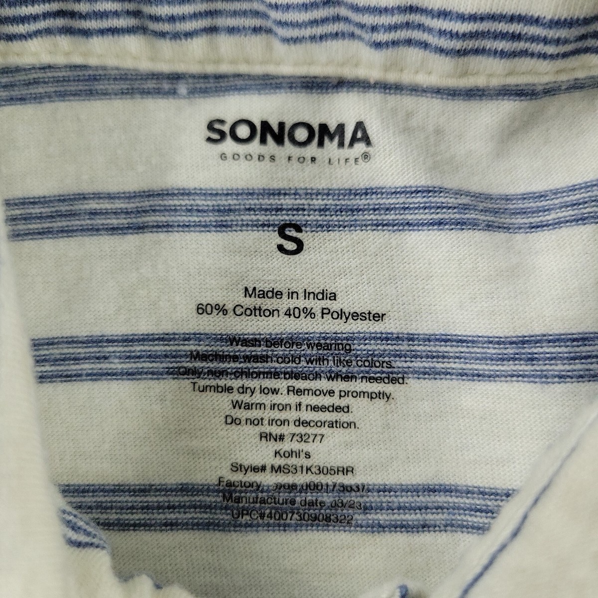 Sonoma Polo Shirt Men’s Small White Blue Striped Short Sleeve Pocket 3 Button